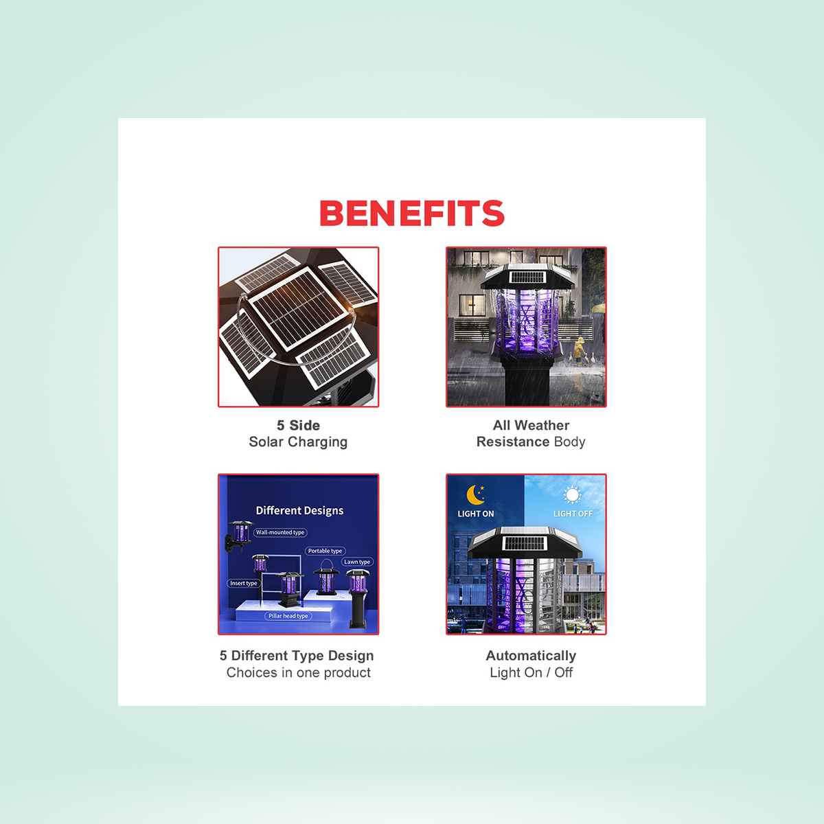 It is ideal for indoor and outdoor use, such as houses, factories, food outlets, restaurants, offices, hospitals, gardens, building complexes, etc. The device is totally weatherproof and as an inbuilt solar panel.